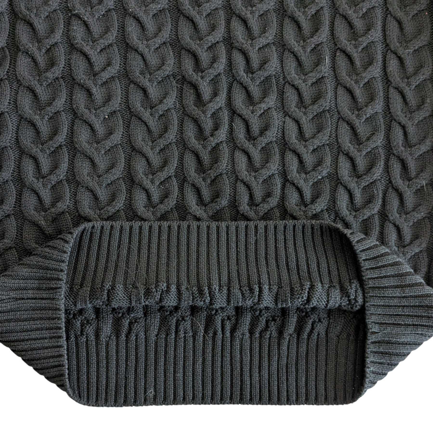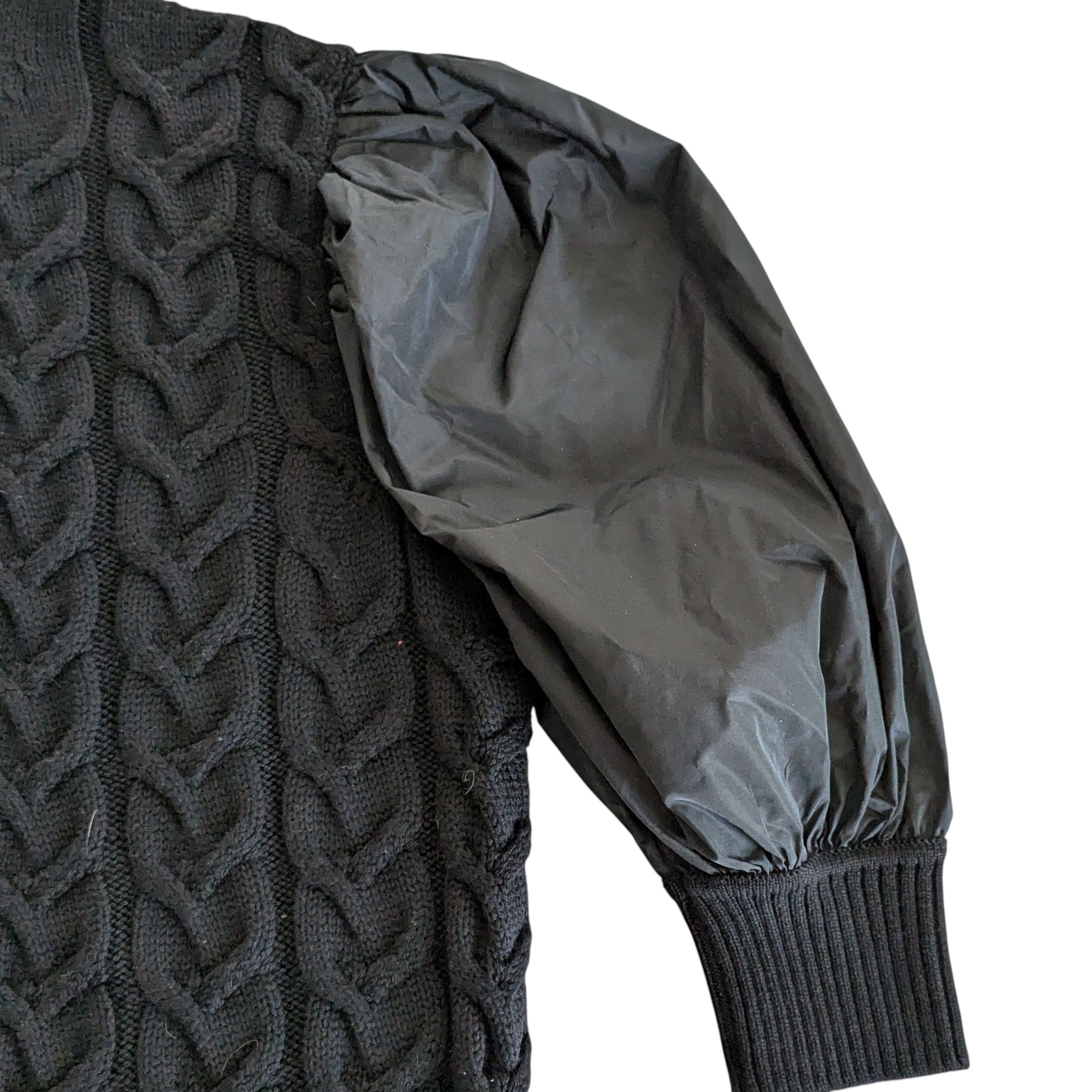 Body 100% virgin wool, sleeves 75% polyester, 25% silk. Dry clean