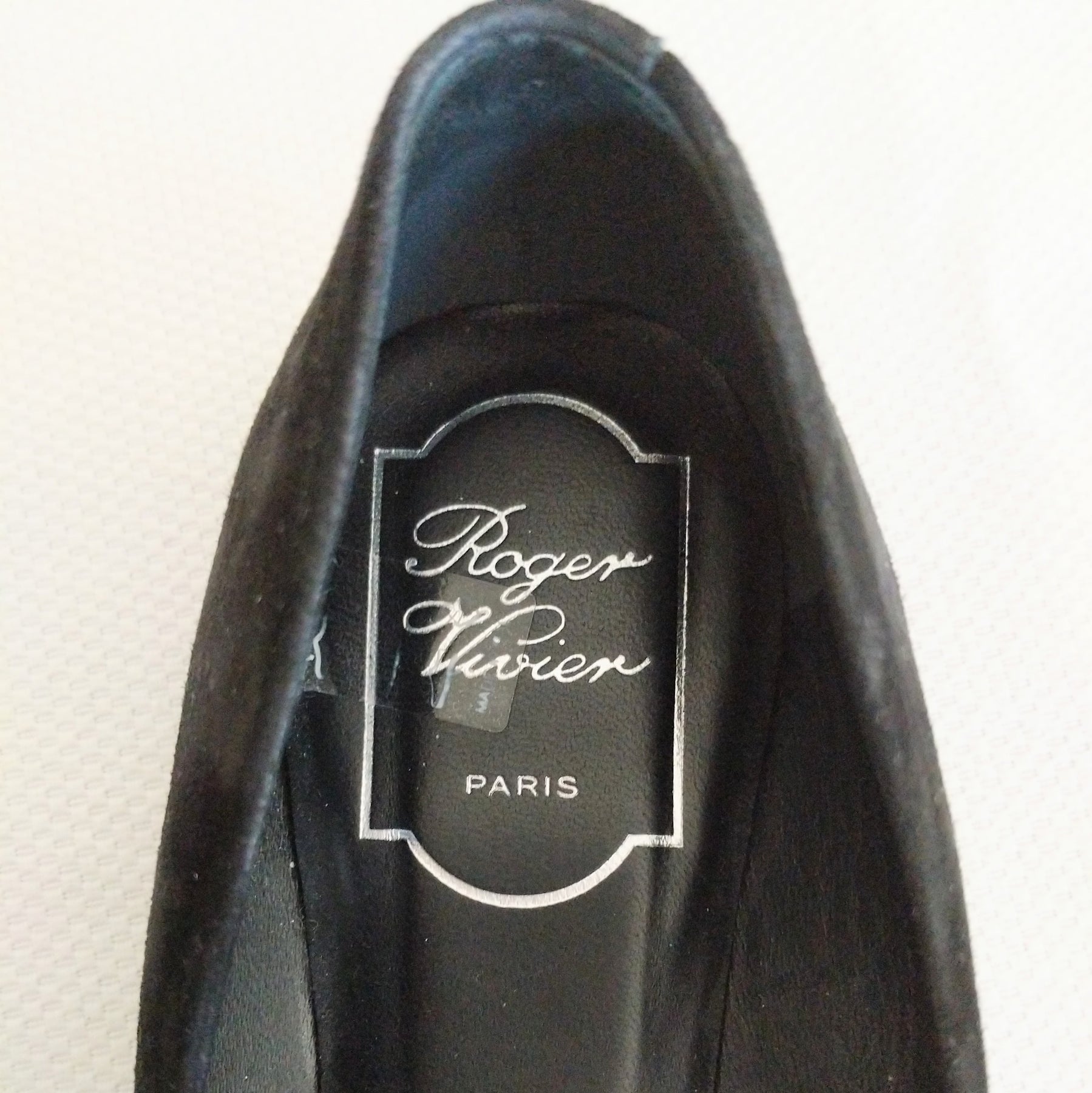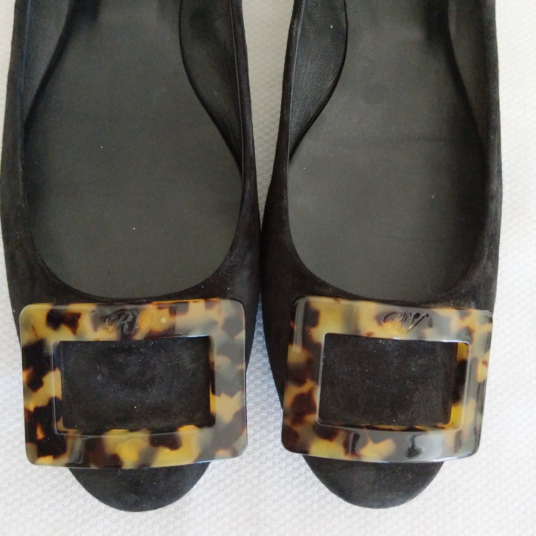 Roger Vivier black suede ballet flats with tortoiseshell buckle detail.