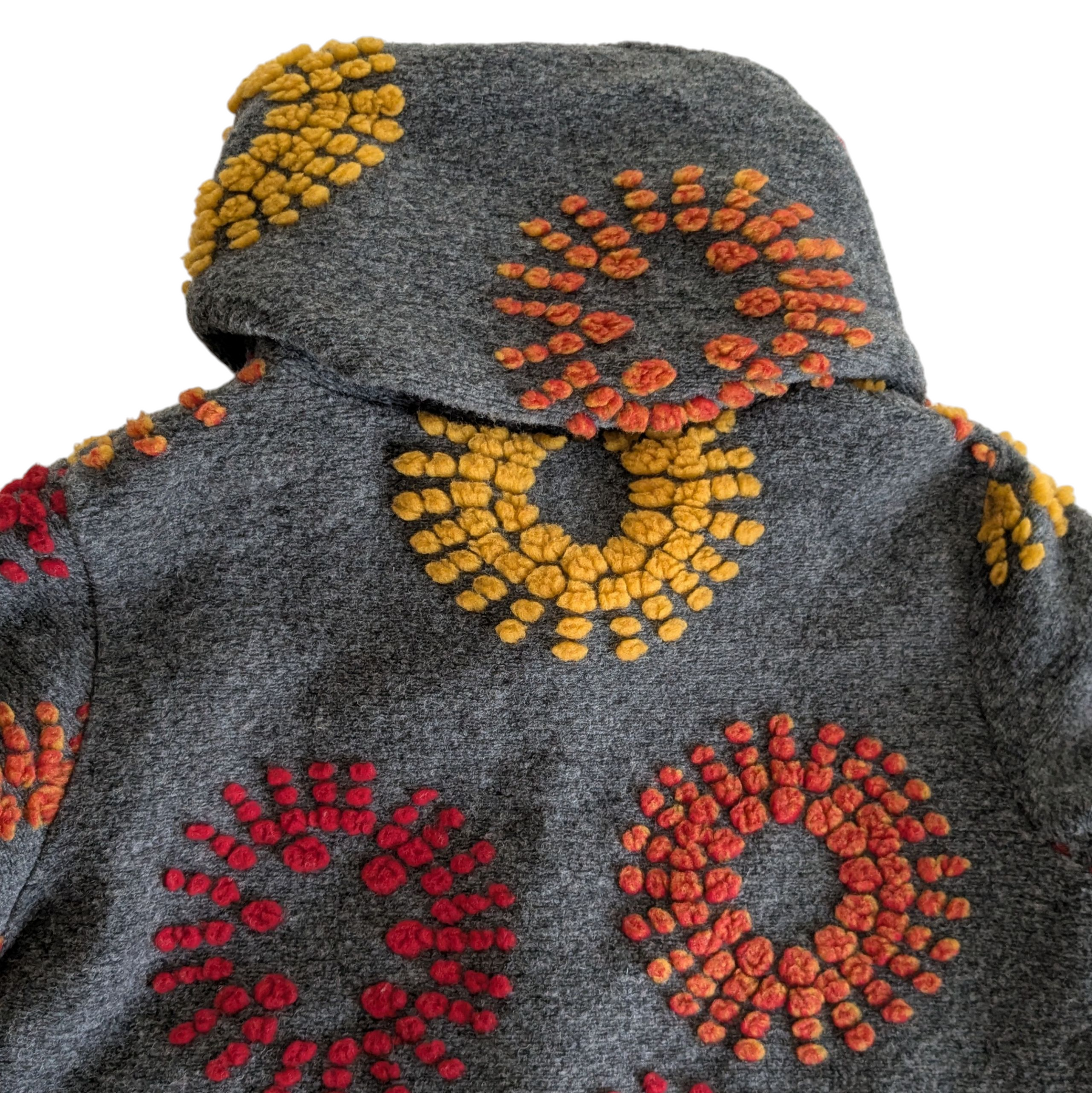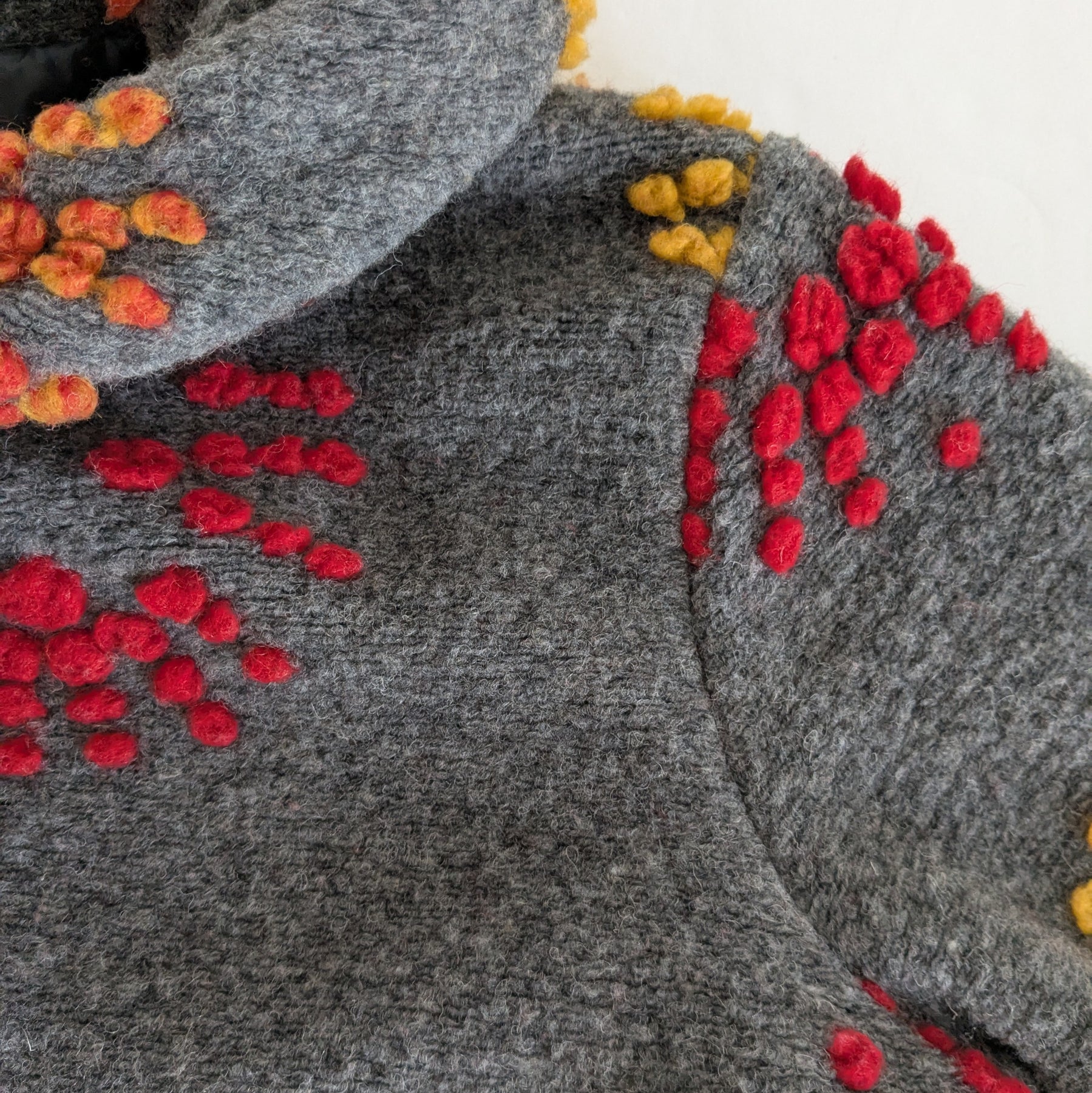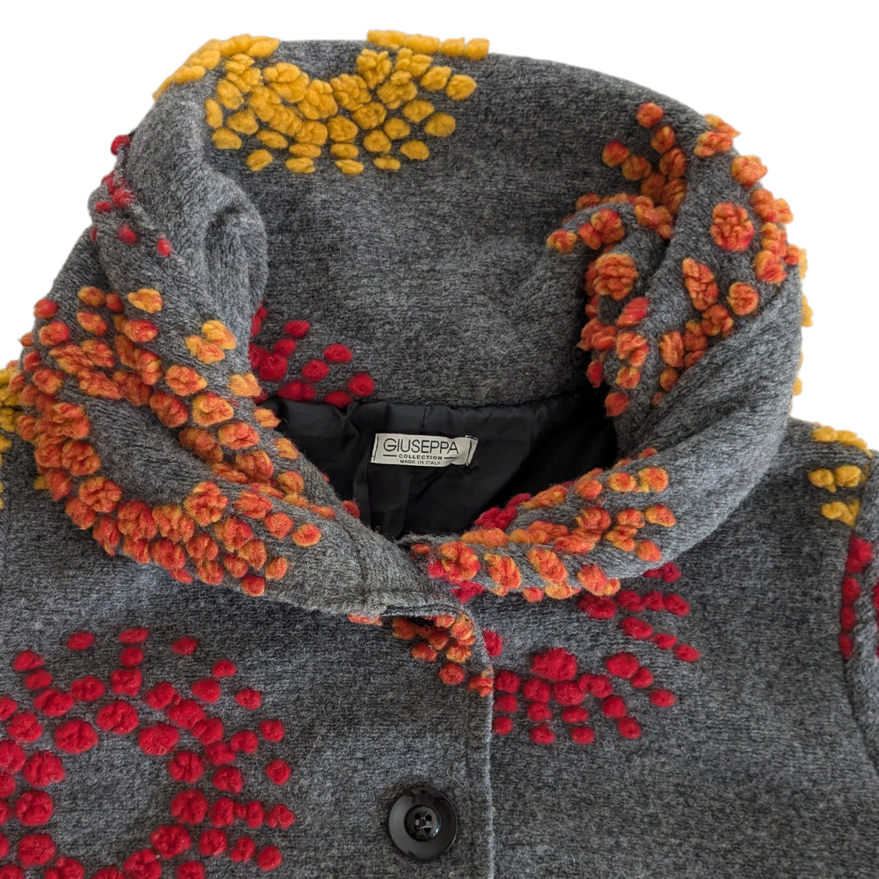Giuseppa heavy weight coat in grey wool blend with red and yellow embroidered flowers