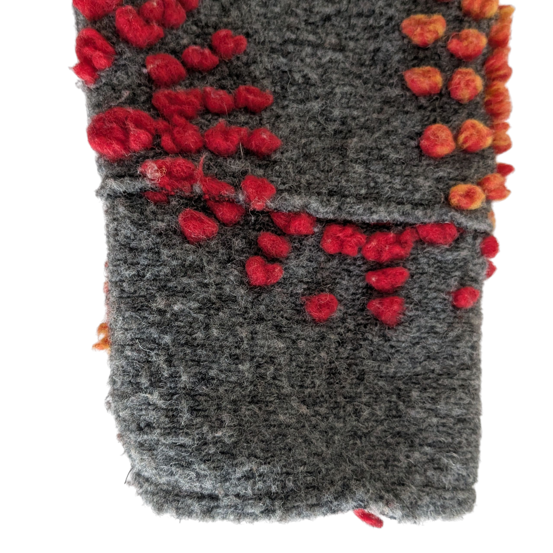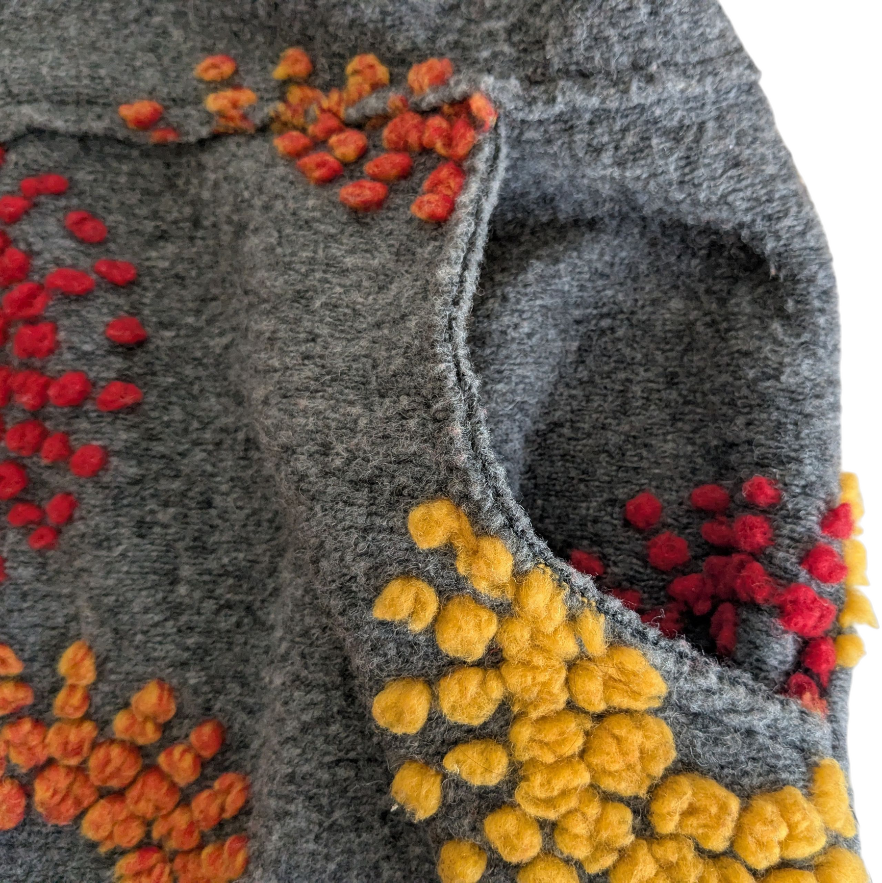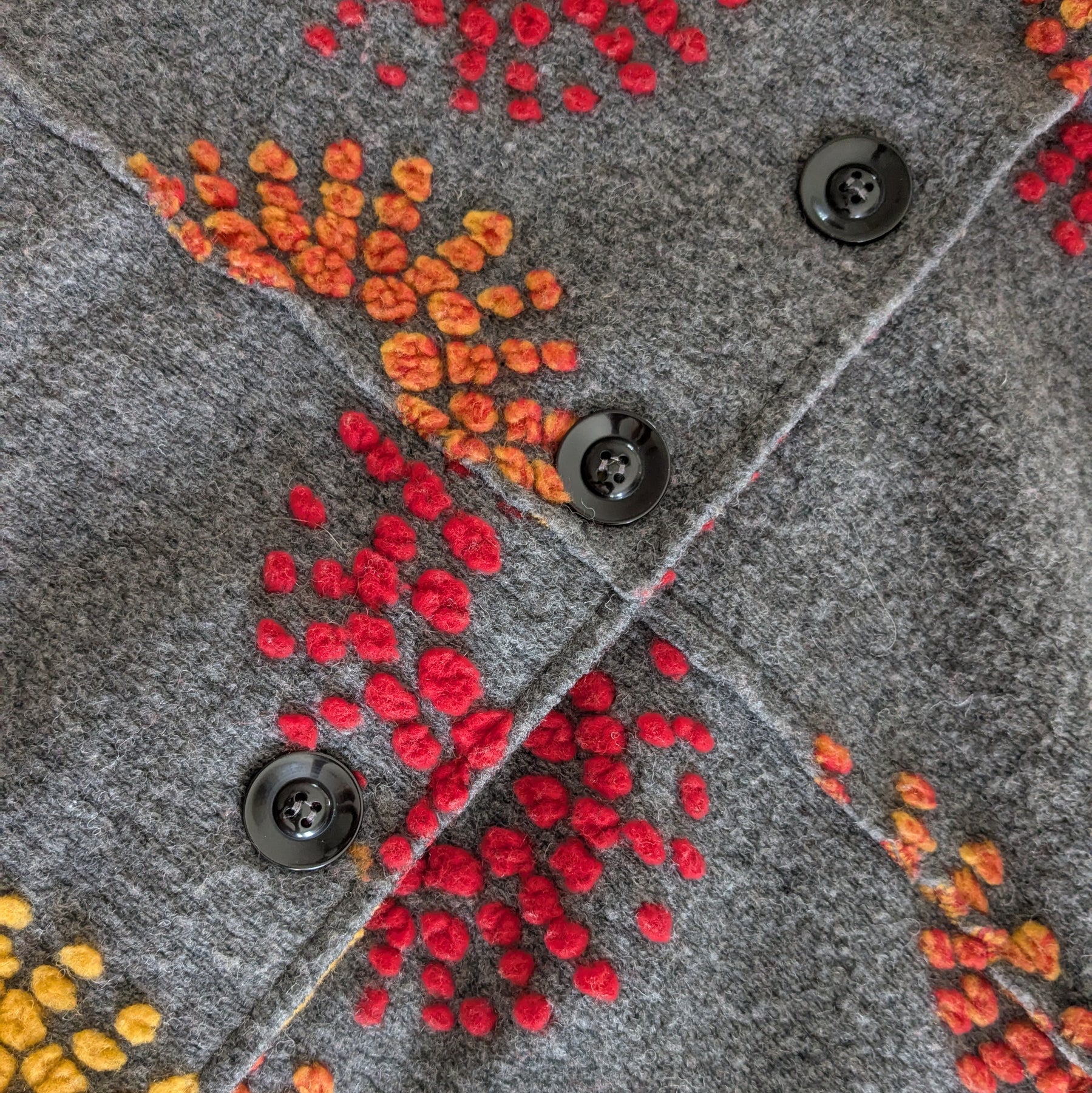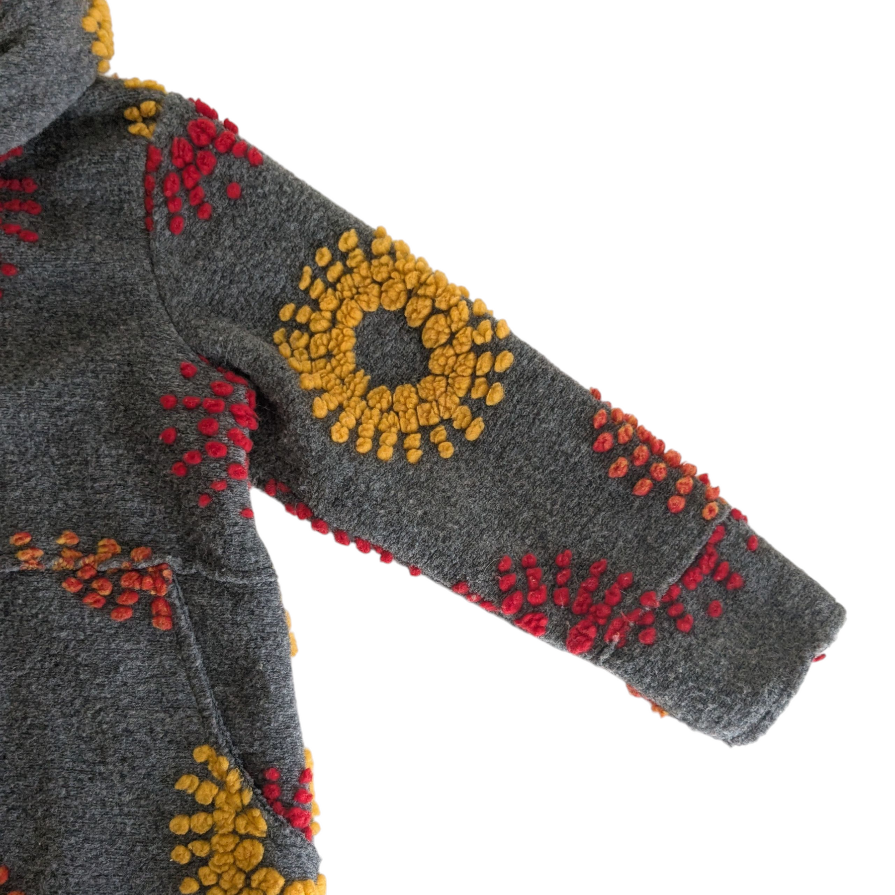 Giuseppa heavy weight coat in grey wool blend with red and yellow embroidered flowers