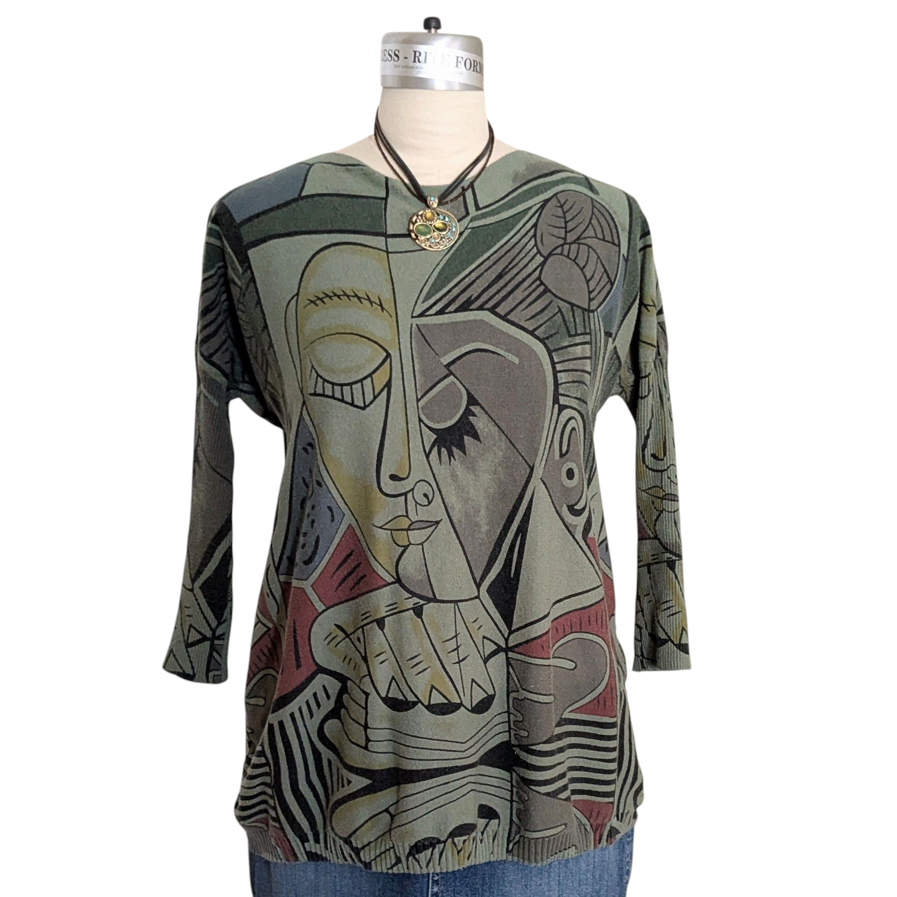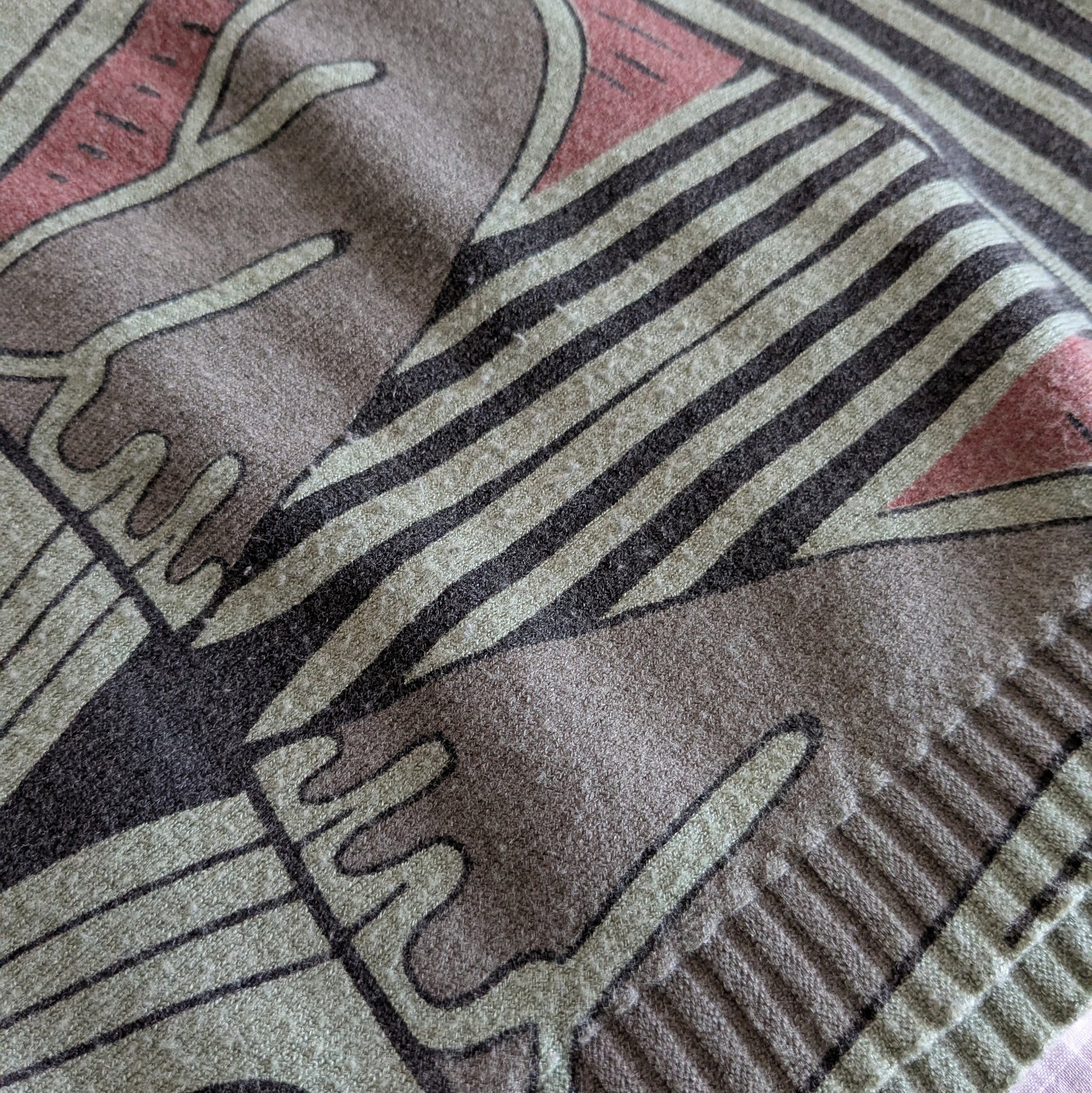 Ella Zhu sweater in olive green with artisan graphic on the front